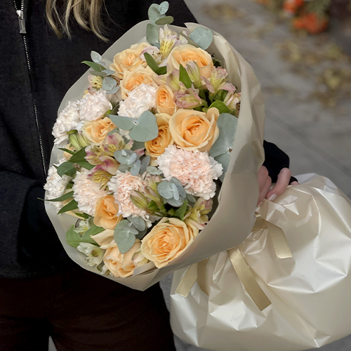 Букет "Пломбирный" из роз Аваланж, диантусов, альстромерий и эвкалипта