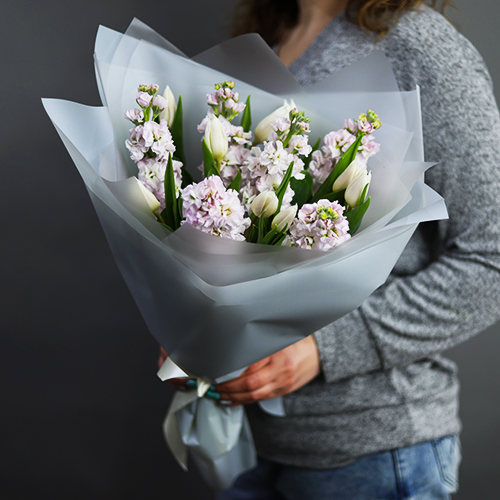 Букет "Половина" из ароматных маттиол и тюльпанов